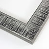 An understated, decorative frame. This slim molding features a raised, uneven, vertical pattern on the face. It has been washed with bright, metallic silver. The black finish underneath is visible along the profile and raised edges.