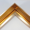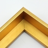 This stair step wood floater frame has a high shine, brushed gold finish with a steep upper and small lower step. The canvas will hover neatly within the simple, modern border.