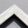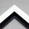 This stair step wood floater frame has a matte white finish with a steep upper and small lower step. The canvas will hover neatly within the simple, modern border.