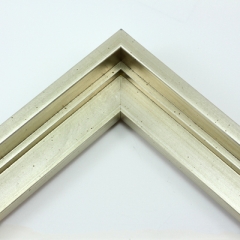 This stair step wood floater frame with a high shine lets your canvas hover neatly within the simple, modern border. The frame features a brushed silver finish with a steep upper and small lower step. The iridescent color varies slightly in different light, running from warm, muted gold to cool, opaque silver.