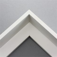 This extra tall, L-shaped floating contemporary canvas floater frame in white features a thin flat face.